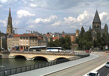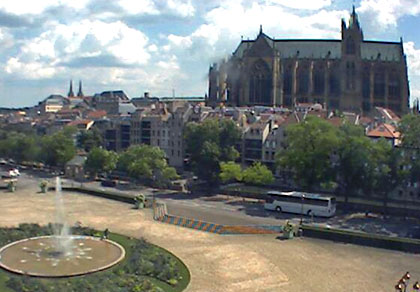 Très beau panorama sur l'impressionnante Cathédrale du diocèse de Metz en Moselle, construite dès 1220. On la visite en particulier pour la qualité de ses verrières (les plus grandes verrières gothiques d'Europe), véritables reflets de l'art sacré du XIIIe au XXe siècle. Avec 6500 m2 de vitraux (!), c'est la cathédrale française qui en possède le plus.